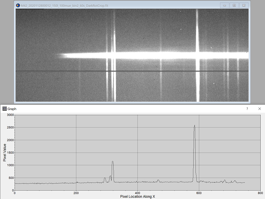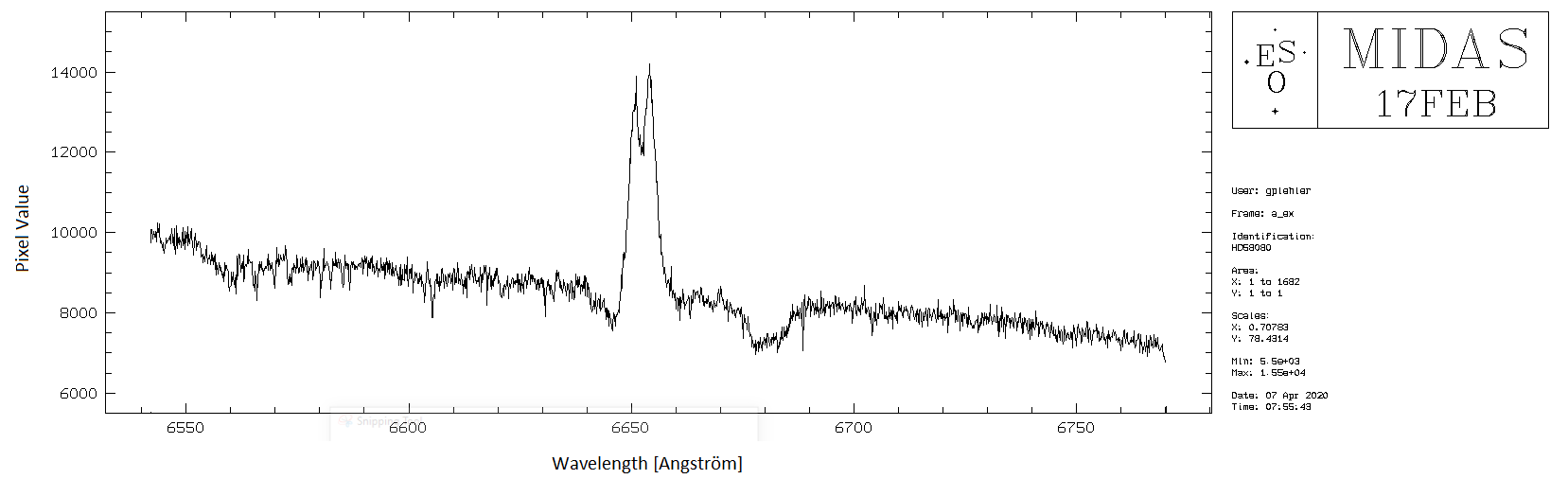 In order to understand which kind of objects can be observed, I try to find out what is the limiting magnetudes for the LHiRes III. To improve the sensitivity I ordered a 150 lines / mm grid which has been used with a 100m slit. Attached please find a spectra of M42 (together with one star of the central Trapez -Region)