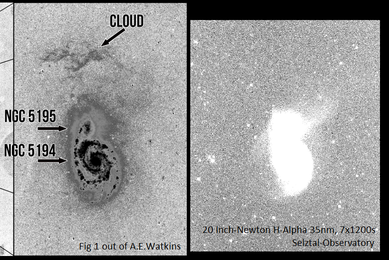 The whirlpool Galaxy M51 (NGC 5195/94) is a well observed object. You might think from an observer perspective there is not very much new, except you use the biggest / last generation telescopes. In this particular case, by surprise, it's different. A.E Watkins et. al. reports in a preprint submitted by April 06th, 2018 "DISCOVERY OF A VAST IONIZED GAS CLOUD IN THE M51 SYSTEM" He and the Co-Authors perform very carefull ground base exposures using a 24 Inch Schmidt-Telesope located at Kit Peak with subsequent image processing and uncovers a cloud nobody has seen before.