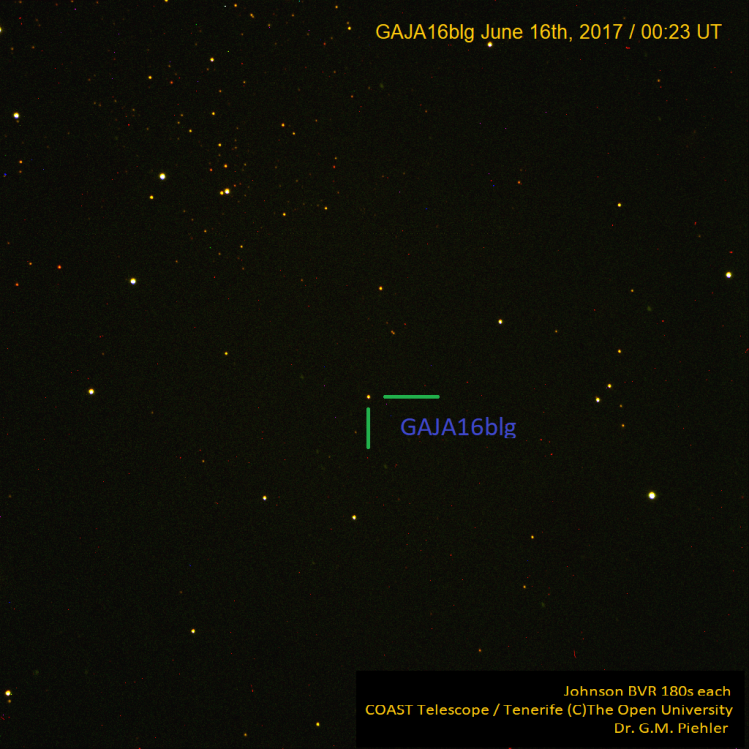 GAIA Alert: GAIA16blg Image taken June 16th, 2017 00:23:00 UT using the COAST Telescope @ Tenerife facilitated by the The Open University imaging details on the enlarge image section. This just a single image out of B,V,R Johnson Filter set. 180s. As I'm gathering more images I'll combine them - I would espect that the quality of the image is going to improve with the number of combined images.