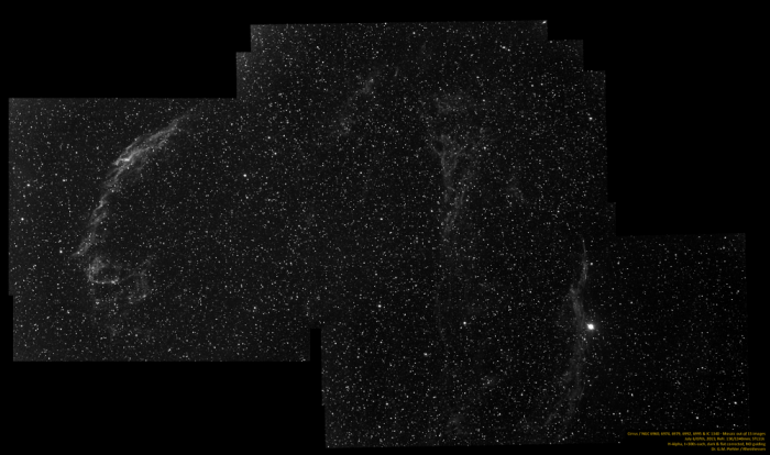 During the night July 06/07th, I took the opportunity to try to do some narrow band H-alpha images having in mind that the moon rises close to 22:00 UT hoping that this will not impact narrow band imaging to much. I selected Cirrus using my 150/1340mm Refractor and tried to do a mosaic out of 15 single images. You may "dive" into the full resolution image - Warning: 6MByte! Time and weather permitting I'll increase depth and/or add more colors.
